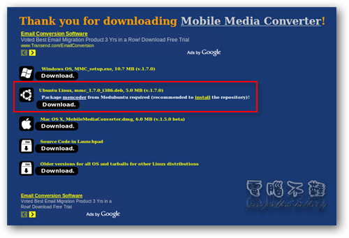 步驟一 利用上面的連結連到Mobile Media Converter的官方網站,接著進入下載頁面,選擇Ubuntu的版本下載。