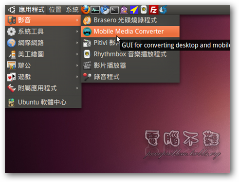 步驟三 安裝好後可以在Ubuntu Gnome選單下的「應用程式→影音」裡找到Mobile Media Converter。