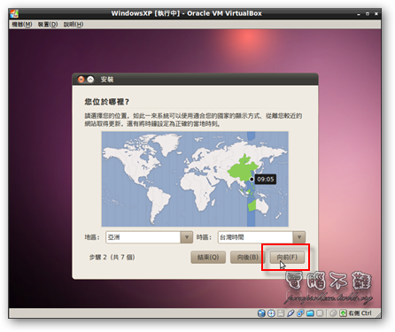 步驟八 選擇時區,按下「向前」。 若此時您有連上網路,那麼Ubuntu安裝程式將會向伺服器自動取得標準時間。