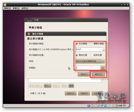 步驟十三 再來切出Ubuntu要安裝的磁區,建議最少要4GB。磁碟格式建議使用EXT4,速度很快。並掛載為「/」目錄。