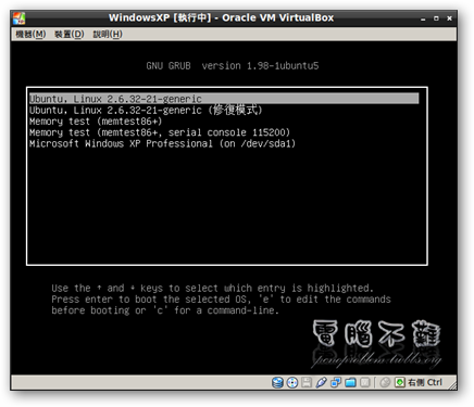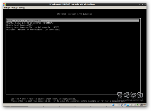 步驟二十 將光碟取出並使用硬碟開機,載入作業系統前,會先出現GRUB選單,你可以在這個時候選擇要進入的作業系統。