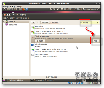 步驟一 進到Ubuntu後,開啟「Ubuntu 軟體中心」,在搜尋框輸入「startup」。找到StartUp-Manager,按下「安裝」。