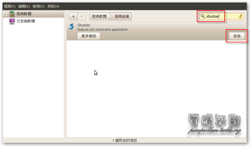 和許多軟體的方法一樣,到Ubuntu 軟體中心下,搜尋的地方輸入「shutter」,便可找得到。