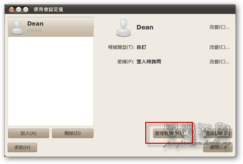 步驟一 開啟「系統->管理->使用者及群組」。接著按下「管理群組」按鈕。