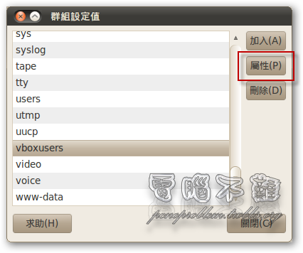 步驟二 找到「vboxusers」屬性,按下「屬性」按鈕編輯。