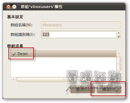 步驟三 勾選要讓VirtualBox使用USB裝置的群組成員,按下「確定」按鈕。