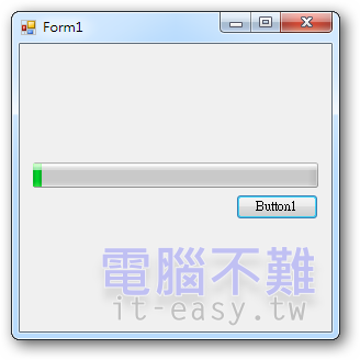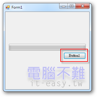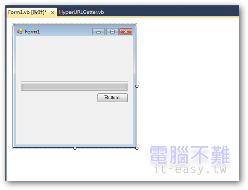表單控制項元件可以任意佈置,沒有硬性規定哪些一定要有。在這裡我佈置Button(Button1)和ProgressBar(ProgressBar1)各一個。按下Button1會讓下載程序開始,ProgressBar1會顯示目前的下載進度。布置結果如下圖: