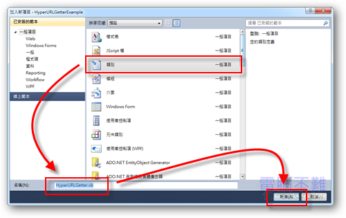 使用HyperURLGetter類別之前,需先將它加入到專案內。以前我習慣另外新增一個模組(Module)來放自己寫的Public Class,但是這個HyperURLGetter實在是有點龐大,乾脆把它另外獨立成一個Class檔案吧!因此若要使用HyperURLGetter,請先加入類別。