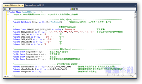 首先要在Form(以Form1為例)內宣告一個全域變數(以DownloadManager為例,可自行更改),並運用WithEvents建立帶有事件的HyperURLGetter類別實體。建構的方法有三種,分別如下: