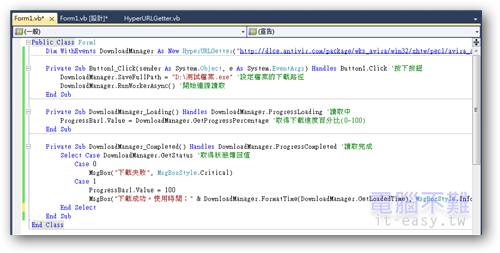 接著要撰寫Button1的Click事件,和DownloadManager的ProgressLoading與ProgressCompleted事件。完成後的程式碼如下: