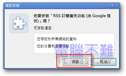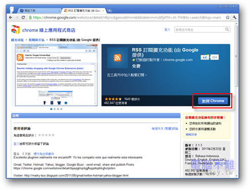 首先到Chrome線上應用程式商店安裝「RSS 訂閱擴充功能 (由 Google 提供)」。可以直接使用Google瀏覽器開啟上面連結,按下頁面中的「加到Chrome」。