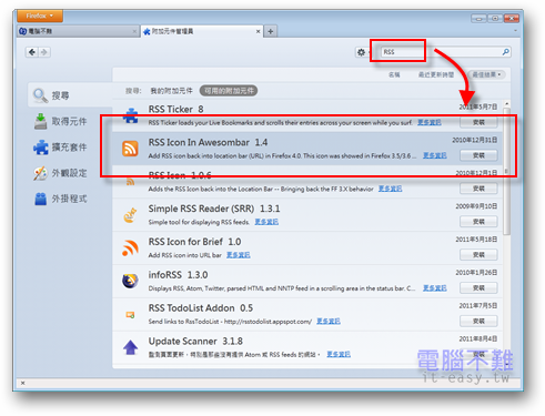 搜尋「RSS」找到「RSS Icon In Awesombar」,按下「安裝」。