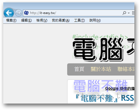 IE8先暫時略過,使用IE9訂閱RSS的問題會比較多,因為IE9的介面太精簡了,很難找到訂閱RSS的按鈕。首先開啟IE9,連到擁有RSS功能的網站頁面。接著按下鍵盤上的「Alt」,IE9的網址列下方會出現功能表列。