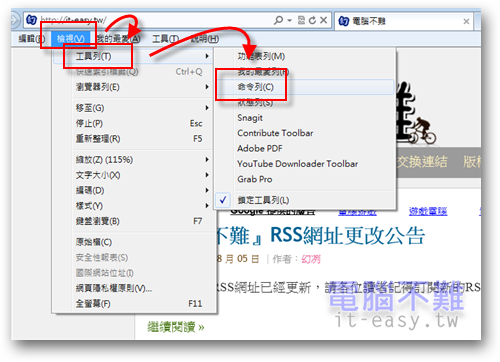 當然如果每次訂閱RSS都要這樣找,實在是很麻煩,可以從「檢視->工具列」中,將「命令列」打勾顯示。