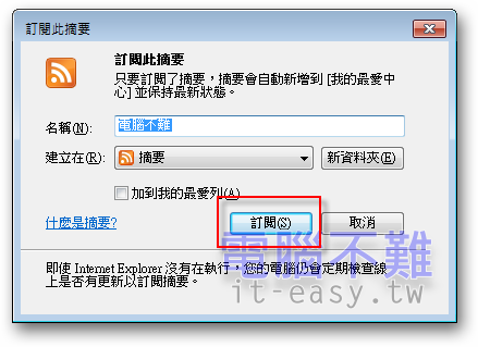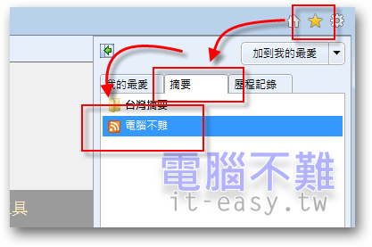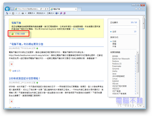 訂閱完成後,就可以在IE的「摘要」中找到剛才訂閱的RSS了。