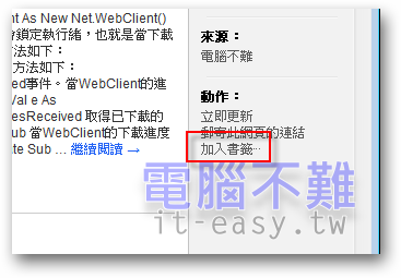 在頁面右方邊欄的下面,可以找到「加入書籤」。
