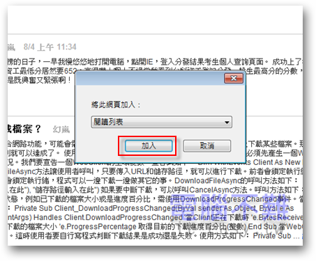 用滑鼠點擊「加入書籤」文字,可將文章加入Safari的「閱讀列表」。