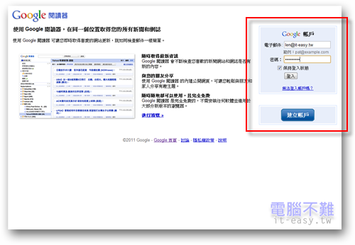 Google提供的RSS訂閱功能必須登入Google帳號使用Google Reader來訂閱RSS。點擊RSS圖示後,就可以「登入並進行訂閱」。