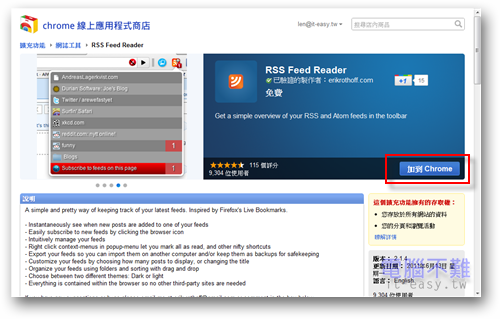 首先到Chrome線上應用程式商店安裝「RSS Feed Reader」。可以直接使用Google瀏覽器開啟上面連結,按下頁面中的「加到Chrome」。