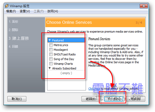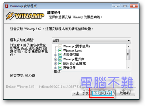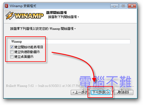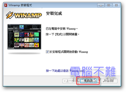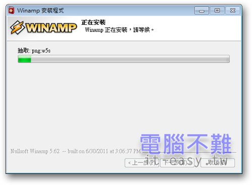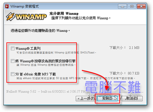 步驟七 建議取消所有Winamp額外功能的選項,因為用不太到。按下「安裝」開始進行安裝程序。