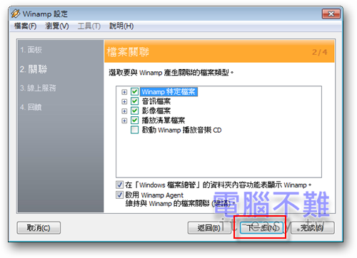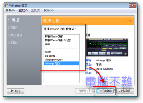 步驟九 第一次開啟Winamp會先要使用者選擇面板,我個人是比較偏好傳統。選擇好後按下「下一步」。