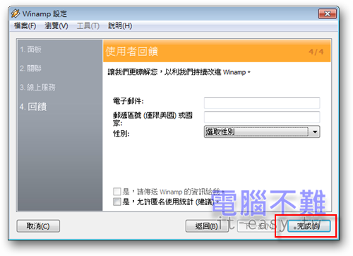 步驟十二 使用者回饋,可以按下「完成」直接跳過。