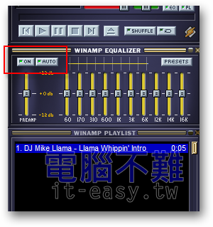 在Winamp的傳統介面中要開啟或關閉等化器很簡單,只要在WIMAMP EQUALIZER區塊中將「ON」按鈕打亮,即可開啟等化器效果。而「AUTO」按鈕可以開啟或關閉自動等化調整功能。