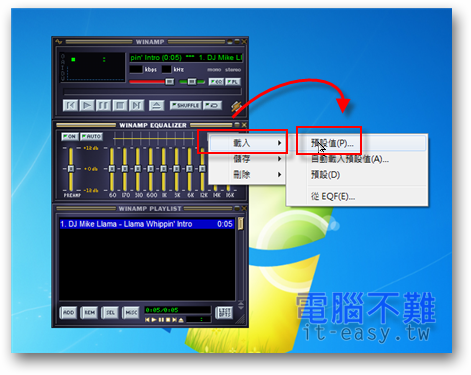 按下PRESETS按鈕會出現功能表選單,可以從「載入->預設值」的地方匯入Winamp內建的等化器設定。