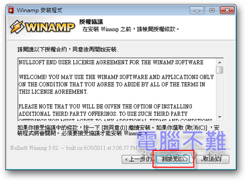 步驟四 進入授權合約的部分,按下「我接受」繼續。