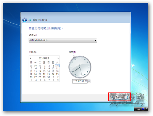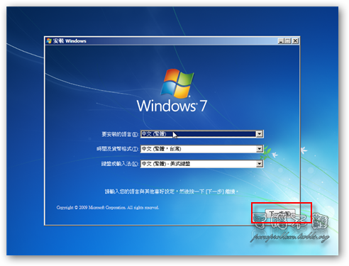 第三步 Windows7的安裝畫面還蠻好看的,預設應該已經幫你調整好語系(繁體中文),如果沒有特殊需求,可以直接按「下一步」,繼續安裝程式。
