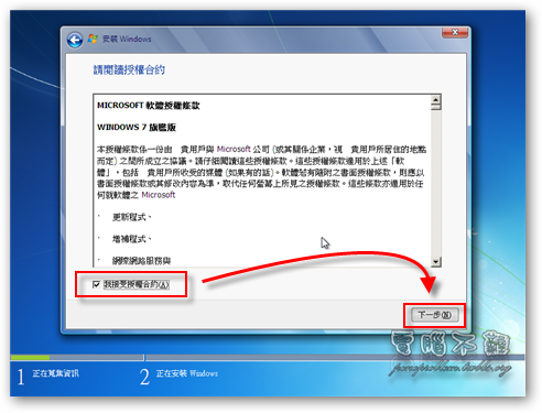 第六步 勾選「我接受授權合約」,按下「下一步」。