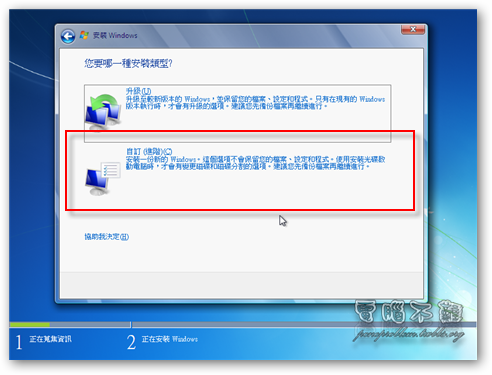 第七步 若是要直接安裝Windows 7,而非升級舊有的作業系統,請按「自訂(進階)」。