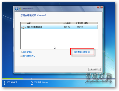 第八步 接著要來分割磁碟機,以我的狀況來說,我目前尚未分割任何的磁碟,因此我選擇未配置的空間後,按下「磁碟機選項(進階)」,來進行更詳盡的磁碟分割設定。