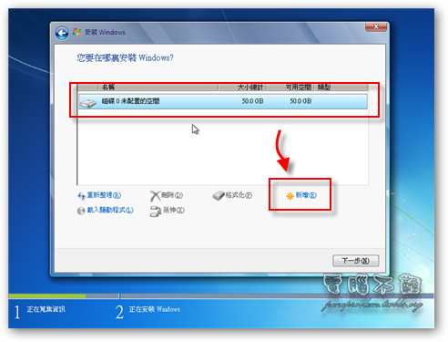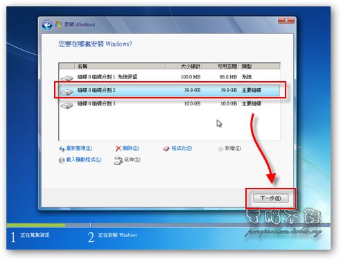 第十二步 分割區都建立好後,選擇要進行安裝的Windows 7系統磁碟分割區位置,接著按下「下一步」。