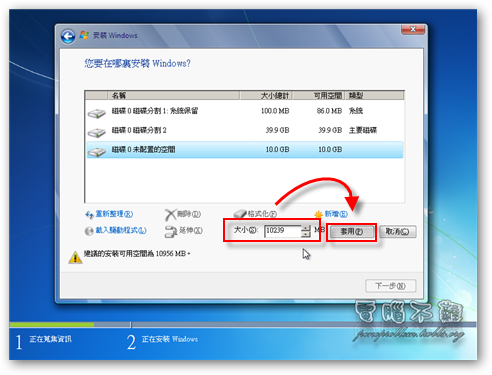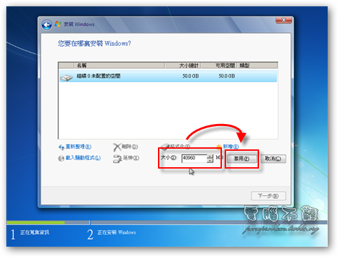 第九步 按下「新增」,接著輸入要分割的磁碟機大小,按下「套用」。