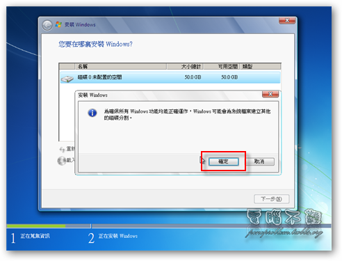 第十步 接著Windows 7可能會提示你要建立其他的磁碟分割,此時只能按下「確定」,之後就會發現你的主磁碟分割區莫名其妙的就被「系統保留」吃掉一個位置(上限是4個)了。當然這個100MB的系統保留分割區,日後可以再移除掉。