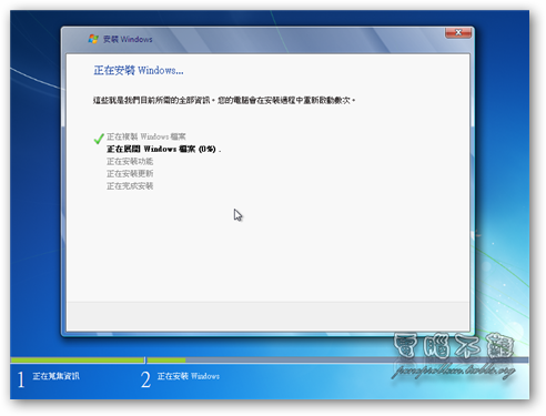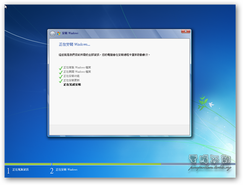 第十四步 真正安裝完成後會重新開機,若你看到「Press any key to boot form CD or DVD…」等字樣的話,它是叫你隨便按下鍵盤的任何一個鍵來從光碟開機。但是我們Windows 7都已經安裝好了,所以甚麼也不用按,讓它自動以硬碟來啟動。