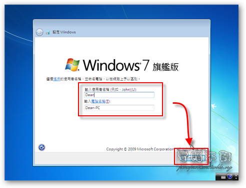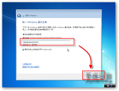 第十七步 輸入購買Windows 7時所附的金鑰。