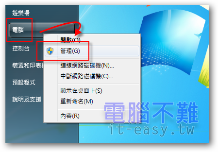 在「電腦」上按下滑鼠右鍵,出現功能表選單,選擇「管理」。