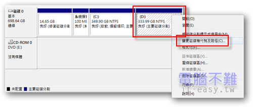 在想要更改代號的磁碟機上按下滑鼠右鍵,出現功能表選單,選擇「更變磁碟機代號及路徑」。