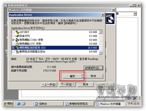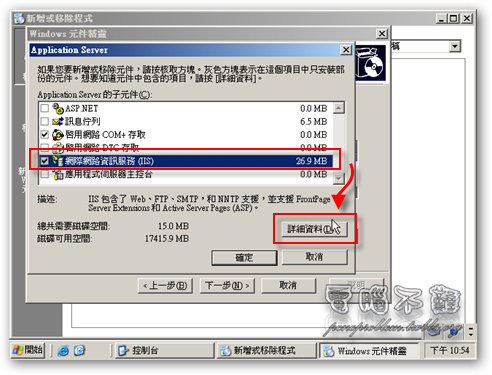 第九步 勾選「網際網路資訊服務(IIS)」,按下「詳細資料」。