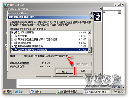 第十步 勾選「檔案轉換通訊協定(FTP)服務」,按下「確定」。此步驟將會為Windows安裝FTP伺服器,以後管理檔案會比較方便。