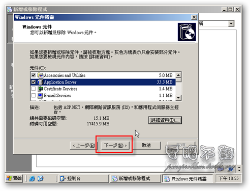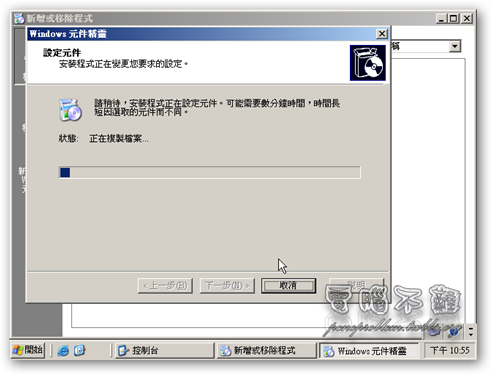 第十二步 按下「下一步」,開始進行安裝。安裝時請放入Windows Server 2003光碟片。