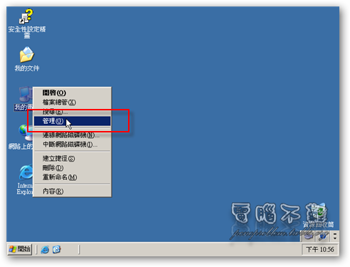 第十四步 在「我的電腦」上按下「滑鼠右鍵」,選擇「管理」。