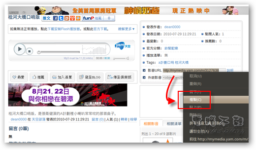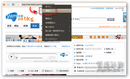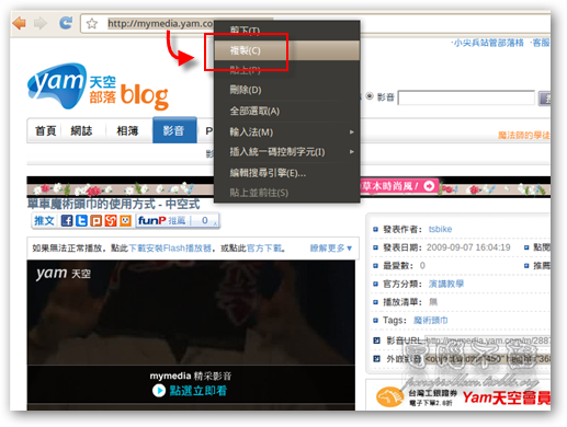 將想要下載的影音,到該影音頁面,複製它的網址。複製網址有兩個方法:第一種方法(下圖上)是直接從瀏覽器的網址列上複製,而第二種方法(下圖下)是複製yam影音在頁面裡本身提供的影音URL。