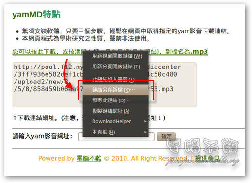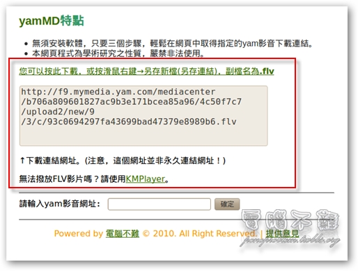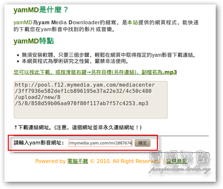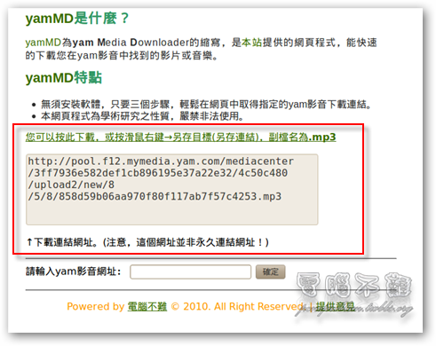 接著就會出現下載網址了。你可以使用上面的文字連結,直接連結或複製該影音的下載網址,或是使用下面的文字方塊,將網址完整的複製下來,貼到續傳軟體內進行下載的動作。這裡要注意的是,這個連結並不是永久的,也就是說,經過一段時間後將會失效,所以你沒有辦法用這個方式取得的連結,將yam提供的mp3音樂,放置到你的網站或是部落格中當作背景音樂。