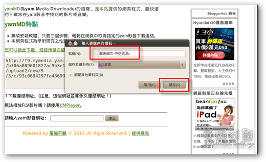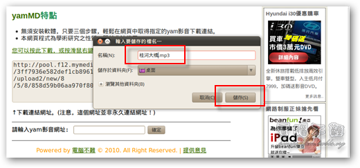 輸入檔名,記得如果是音樂檔案,副檔名要為.mp3。影片檔的話,就是.flv。命名好檔案後,開始下載吧。
