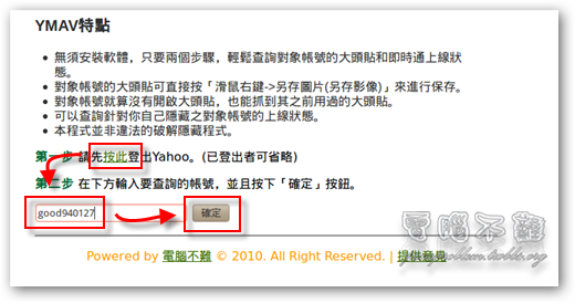 第二步,輸入要查詢的即時通帳號,無須「@」!因為這已經是針對Yahoo即時通帳號而設計的程式。例如我輸入「good940127」,接著按下「確定」按鈕。
