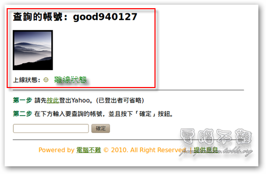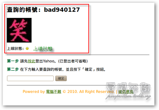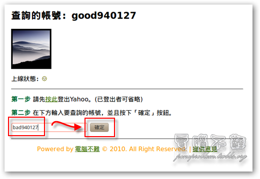 若還想繼續查詢下一個帳號,可以直接從第二步驟開始,因為剛才已經有先登出Yahoo了。輸入要查詢的帳號,按下「確定」按鈕。